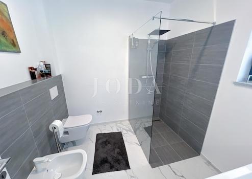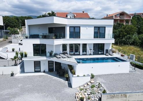 Auf dem erhöhten Teil von Crikvenica, umgeben von Familienhäusern, steht ein freistehendes modernes Haus mit Panoramablick aufs Meer zum Verkauf.