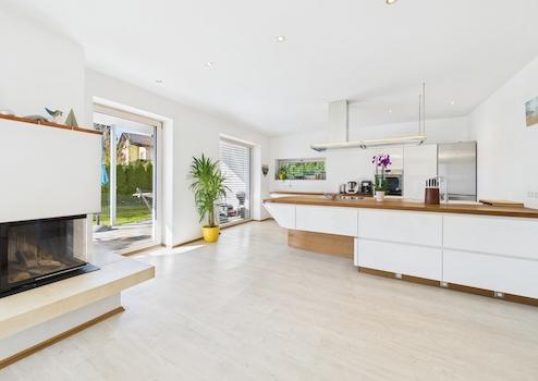 Die Villa erstreckt sich über drei Ebenen und überzeugt mit lichtdurchfluteten Räumen, großzügigen Fensterfronten und einer offenen Gestaltung, die ein einzigartiges Wohngefühl schafft. Das Herzstück bildet der elegante Wohn- und Essbereich mit einer hochwertigen Alno-Designerküche (Neupreis 45.000€), ausgestattet mit erstklassigen Miele-Geräten. Die großzügige Kochinsel, inspiriert von einer Bootsform, lädt zum gemeinsamen Kochen und Genießen ein. Ein stilvoller Kamin sorgt für wohlige Wärme und eine behagliche Atmosphäre, während die angrenzende Terrasse mit Südausrichtung einen perfekten Ort zum Entspannen, Grillen oder Sonnenbaden bietet.