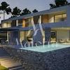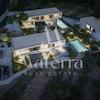 Erdgeschoss: Umfasst ein Wohnzimmer mit offener Küche und Essbereich (ca. 52 m²), ein Schlafzimmer mit eigenem Bad und begehbarem Kleiderschrank (31 m²) sowie Zugang zur überdachten Terrasse. Zudem gibt es eine Sommerküche und eine zusätzliche überdachte Terrasse von 34,60 m². Auf der Vorderseite befinden sich der Pool und der Liegebereich.
