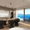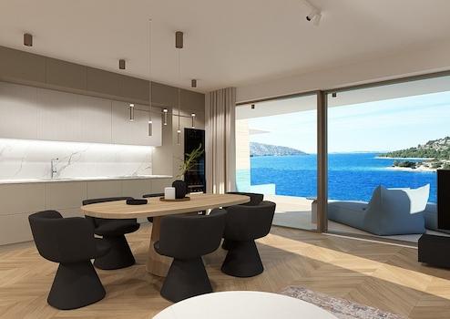 Die Wohnung besteht aus einem geräumigen Wohnzimmer mit Küche und Essbereich im offenen Konzept, das auf eine Terrasse mit Meerblick und einem dazugehörigen Pool führt. Es gibt drei Schlafzimmer, von denen zwei ein eigenes Bad haben. Die Zimmer sind einzigartig, da die gesamte Seitenwand aus Glas besteht, was einen einzigartigen Blick auf das Meer und die Inseln ermöglicht. Die Wohnung verfügt außerdem über ein zusätzliches Bad, insgesamt drei.