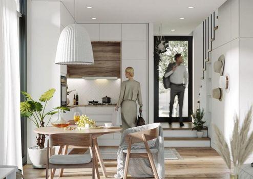 Auf einem Grundstück von ca. 250 m² erstreckt sich das Haus über zwei Etagen. Im Erdgeschoss befindet sich der großzügige Wohn- und Essbereich, der durch die großen Fensterfronten viel Tageslicht einfängt und einen herrlichen Ausblick auf die umliegende Natur bietet. Die offene Küche ist modern ausgestattet und lädt zum gemeinsamen Kochen und Genießen ein. Ein helles Schlafzimmer, ein Badezimmer und ein Gäste-WC komplettieren das Erdgeschoss.