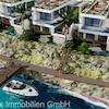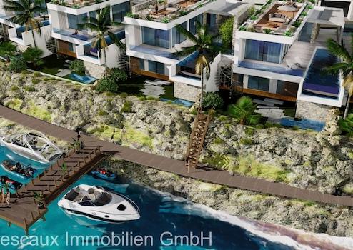 Die 8 exklusiven Villen an der vorderen Fassade befinden sich am Rande der felsigen Klippe. Die Dachterrasse bietet einen 360-Grad-Blick auf das Meer und die Berge auf der Rückseite. Die drei Schlafzimmer gehen mit dem Blick über den Garten auf das Meer hinaus.