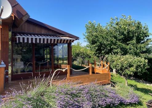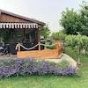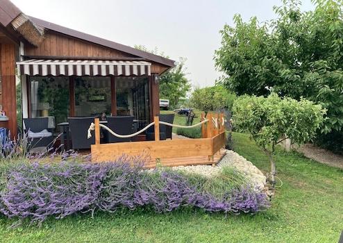 Es ist umgeben von diversen Obstbäumen und Lavendelbewuchs.