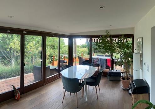 Blick auf Terrasse und Wintergarten