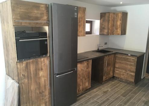 eine integrierte Paletten Küche und Kaminofen/Schweden-Ofen mit ca. 6 kw Wärmeleistung.