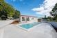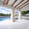 Große Glaswände im Wohnbereich des Hauses führen auf eine überdachte Terrasse und in den weitläufigen Garten (790 m2). Hier befindet sich ein großer Pool (10 x 4,5 m) mit Liegewiese.