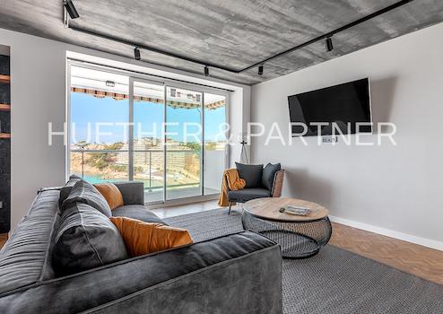 Das Apartment verfügt über eine offene, voll ausgestattete Einbauküche mit modernen Elektrogeräten, eine Kombination aus edlem Fliesen- und Holzboden, sowie doppelt verglaste PVC-Fenster und Aluminiumblendläden, die für angenehmes Raumklima sorgen. Eine effiziente Klimaanlage (warm/kalt) rundet das Wohlfühlambiente ab.