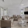 Großzügiges Wohnzimmer mit offener Verbindung zur Küche, ausgestattet mit luxuriösen Ledersofas, moderner Spotbeleuchtung und Terrassentüren zum Privatgarten. Die weiße Decke und der Holzboden sorgen für eine zeitgemäße Ausstrahlung.