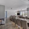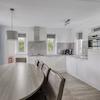 Moderne Eckaufstellung mit weißen Schränken, grauer Arbeitsplatte und Einbaugeräten. Die Küche verfügt über eine Dunstabzugshaube und bietet ausreichend Arbeitsfläche. Der Essbereich mit Hängelampe und Lederstühlen vervollständigt den Raum.