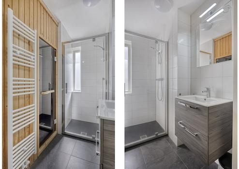 Badezimmer mit Dusche, Sauna mit Holzverkleidung, modernem Badmöbel und Handtuchheizkörper. Eine Wellness-Ausstattung, die das Haus auszeichnet.