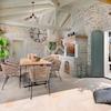 Im Erdgeschoss befindet sich ein geräumiges Wohnzimmer mit Kamin und SAT-TV und Zugang zu einer geräumigen überdachten Terrasse mit Esstisch, Kamin für Grill- und Wohnbereich, großer, voll ausgestatteter Küche mit Essbereich, einem Doppelzimmer mit Doppelbett, eigener Dusche / Toilette und Ausgang zur Terrasse, separate Toilette im Wohnzimmer und Dusche / WC auf der Terrasse.
