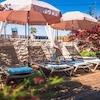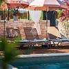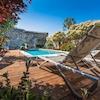 Im Außenbereich erwartet Sie ein privater, beheizter Salzwasserpool von 23 m² mit Sonnenliegen, Sonnenschirmen und einer Außendusche. Eine überdachte Terrasse mit Grill, Außenküche und steinernem Loungebereich lädt zum Genießen unter freiem Himmel ein. Der umzäunte Garten mit reifer mediterraner Bepflanzung bietet Privatsphäre und Sicherheit für Familien.