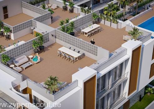 Dort, wo sich Qualität und moderne Architektur unter einem Dach treffen, bieten wir Ihnen soziale Bereiche wie eine insgesamt 2000 m2 große Grünfläche, umgeben von Olivenbäumen, dem Symbol Zyperns, einen Swimmingpool und ein Kinderbecken, wo Sie die Sonne und das Wetter genießen können, sowie einen Kinderspielplatz, auf dem sich Ihre Kinder unter Ihrer Aufsicht vergnügen können.