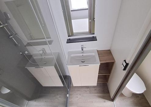 Das zentrale Badezimmer verfügt über eine moderne Duschkabine, ein Waschbecken mit Spiegel sowie praktische Ablageflächen. Hell, funktional und ideal für den täglichen Gebrauch.