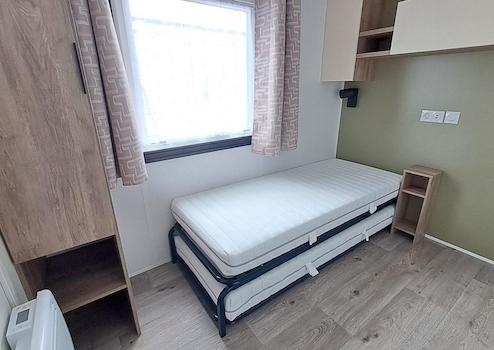 Das zweite Schlafzimmer ist mit einem platzsparenden Ausziehbett für zwei Personen ausgestattet – perfekt für Kinder oder Gäste. Auch hier gibt es ausreichend Stauraum.