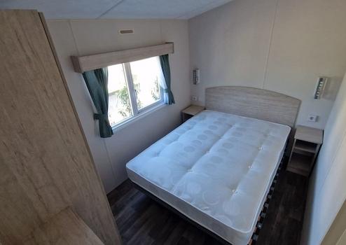 Komfortables Hauptschlafzimmer mit Doppelbett, Nachttischen, geräumigem Kleiderschrank und zusätzlichem Stauraum. Das Fenster sorgt für natürliches Licht und frische Luft.