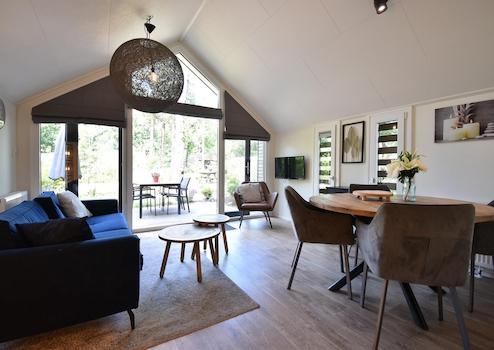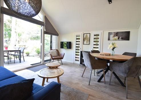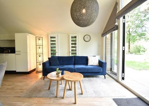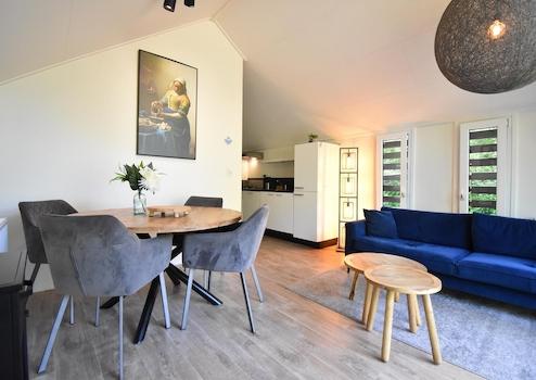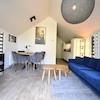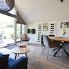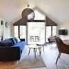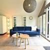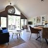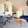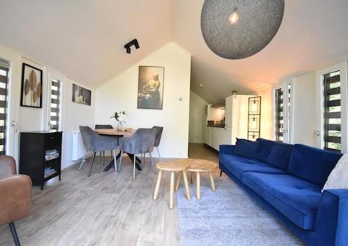 Das helle Wohnzimmer bildet das Herz dieses modernen Chalets. Die offene Verbindung zur Küche schafft ein großzügiges Raumgefühl trotz der kompakten 44 m². Die Terrassentüren zur Terrasse sorgen für eine perfekte Innen-Außen-Verbindung. Von der komfortablen Sitzecke blicken Sie direkt auf den Bach und die grüne Umgebung. Die moderne Einrichtung mit blauen Akzenten und Holzdetails strahlt Wärme und Gemütlichkeit aus. Der Esstisch bietet Platz für vier Personen für gesellige Mahlzeiten.
