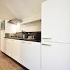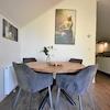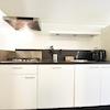 Die moderne offene Küche in eleganter weißer Ausführung bietet allen Komfort für kulinarische Momente. Die Küche verfügt über komplette Einbaugeräte einschließlich Gasherd, Mikrowelle, Kühlschrank und Dunstabzug. Die dunkle Arbeitsplatte bildet einen schönen Kontrast zu den weißen Schränken und bietet ausreichend Arbeitsfläche. Die praktische Aufteilung und großzügigen Staumöglichkeiten machen das Kochen zum Vergnügen. Die offene Verbindung zum Wohnzimmer hält den Koch in der Gesellschaft eingebunden und vergrößert das Raumgefühl.