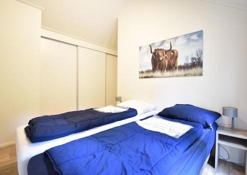 Das Hauptschlafzimmer bietet Ruhe und Komfort mit zwei separaten Betten, die flexibel genutzt werden können. Der große Kleiderschrank mit Schiebetüren sorgt für allen benötigten Stauraum. Das Fenster bietet Aussicht auf die grüne Umgebung und sorgt für ausreichend natürliches Licht. Die neutralen Farben und moderne Ausstattung schaffen eine ruhige Atmosphäre. Die Zentralheizung garantiert eine behagliche Temperatur in allen Jahreszeiten.