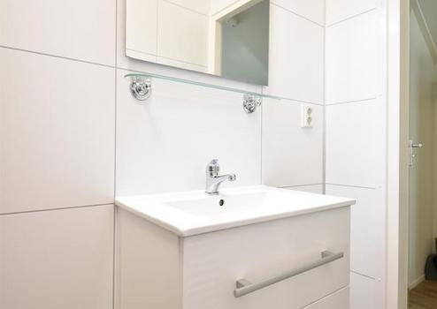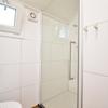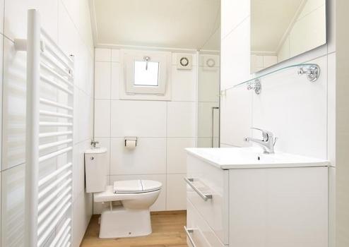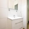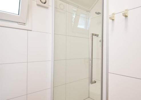 Das moderne Badezimmer strahlt Luxus aus mit seiner eleganten weißen Ausstattung und hochwertigen Materialien. Die großzügige ebenerdige Dusche mit Glaswand bietet Komfort und Bequemlichkeit. Das moderne Waschbecken mit Spiegel und Stauraum ist praktisch eingerichtet. Die Toilette vervollständigt die sanitären Einrichtungen. Die hellen Fliesen und durchdachte Aufteilung sorgen für eine zeitlose Ausstrahlung, die jahrelang Bestand hat.