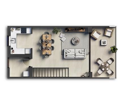 Die Reihenhäuser verfügen über zwei Schlafzimmer und zwei voll ausgestattete Bäder. Die großzügigen Terrassen, eine im Erdgeschoss und eine im Obergeschoss, laden zu herrlichen Momenten mit der Familie oder Freunden unter freiem Himmel ein.
