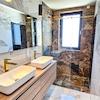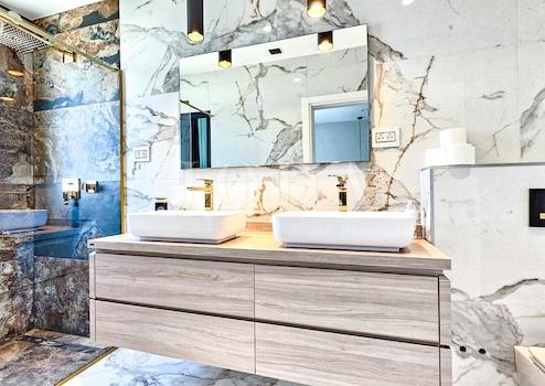 - Hansgrohe metropol gold optic Duschen und Badezimmerfliesen und Vileroy & Boch Sanitärkeramik, Geberit sigma Wassertank