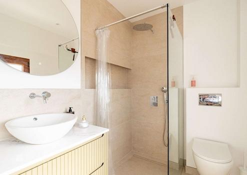 - Zwei moderne Badezimmer, beide stilvoll ausgestattet mit hochwertigen Armaturen und zeitlosem Design.