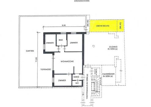 RAUMAUFTEILUNG: Eingangsbereich, 3 Zimmer, Wohnküche mit Essbereich, 2x Bad, großzügige Süd-Terrasse mit Privatgarten