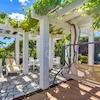 Vor dem Haus befindet sich auf über 1000 m2 ein Garten mit vielen Einrichtungen wie Schwimmbad, Bowlingbahn, Sonnendeck, Kinderspielplatz und Spazierwegen durch ein liebevoll angelegtes Areal mit mediterranen Pflanzen.