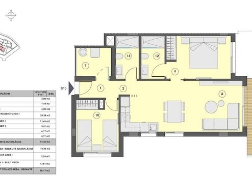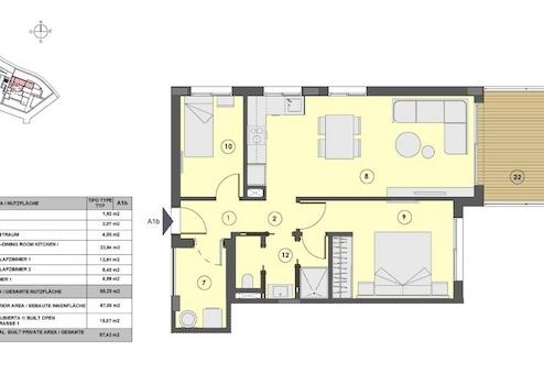 Angebote Wohnung 3 Zimmer (2 Schlafzimmer, 1 Bad, Terrasse, Abstellraum, Stellplatz) - bebaute Wohn-Nutz-Fläche 93 m², davon 25 m² Terrasse.