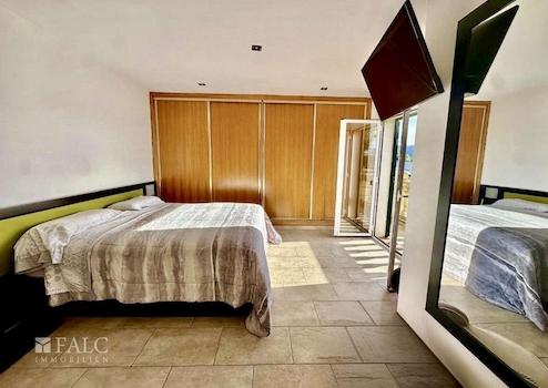 Im Obergeschoss befinden sich drei großzügige Schlafzimmer, die allesamt durch eine durchdachte Raumaufteilung und viel Tageslicht überzeugen. Das Hauptschlafzimmer verfügt über ein eigenes Badezimmer en suite mit Whirlpool-Badewanne, einen geräumigen Einbauschrank sowie eine private Terrasse mit herrlichem Panoramablick auf die Berge – ein perfekter Rückzugsort für entspannte Momente. Das zweite Schlafzimmer ist ebenfalls mit einem Einbauschrank ausgestattet und bietet Platz für ein Doppelbett. Das dritte Schlafzimmer hat Zugang zu einer weiteren Terrasse. Ein zweites, voll ausgestattetes Badezimmer mit Badewanne steht den beiden Zimmern zur Verfügung und komplettiert die Etage.