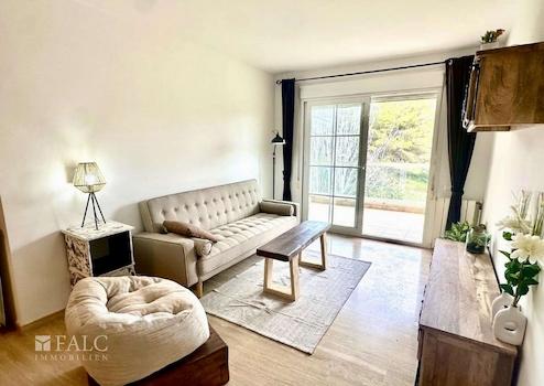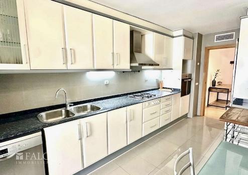 Beim Betreten der Wohnung empfängt ein eleganter Eingangsbereich die Bewohner und ihre Gäste. Von hier aus gelangt man in die separate, ausgestattete Küche mit angeschlossenem Hauswirtschaftsraum – ein durchdachter und praktischer Bereich, der sich perfekt in das gehobene Wohnkonzept einfügt. Direkt anschließend öffnet sich der Wohn- und Essbereich, der dank großer Fensterflächen in natürlichem Licht erstrahlt. Die geschmackvolle Einrichtung und die offene Gestaltung schaffen eine angenehme Atmosphäre, die durch den direkten Zugang zur privaten Terrasse abgerundet wird. Diese bietet einen Ausblick auf das Schloss Bellver und lädt dazu ein, die Ruhe der Umgebung sowie das milde, mediterrane Klima in vollen Zügen zu genießen.