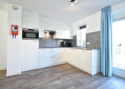 Die Küche von Piet Hein 216 ist speziell für die Zubereitung von Mahlzeiten für größere Gesellschaften eingerichtet. Die L-förmige Aufstellung mit weißen Schränken und grauen Arbeitsplatten bietet viel Arbeits- und Stauraum. Alle modernen Einbaugeräte sind vorhanden: Kühlschrank, Geschirrspüler, Kombi-Mikrowelle, Induktionskochfeld und Edelstahl-Dunstabzug.