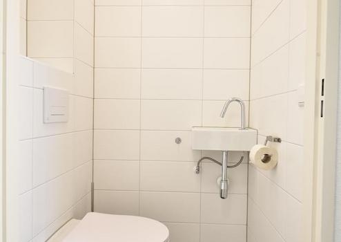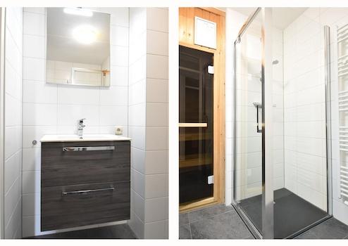 Das Badezimmer von Piet Hein 216 bietet dasselbe luxuriöse Wellness-Erlebnis wie sein Nachbarhaus, mit einer eigenen Holzsauna als absolutem Höhepunkt. Diese seltene Ausstattung in einem Ferienhaus macht den Unterschied zwischen einem gewöhnlichen Urlaub und purer Entspannung.