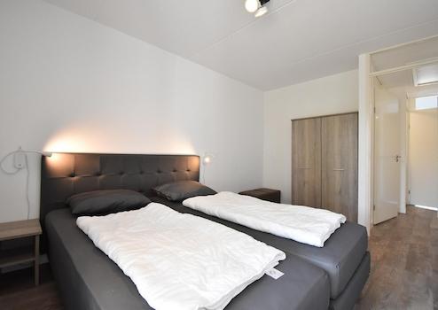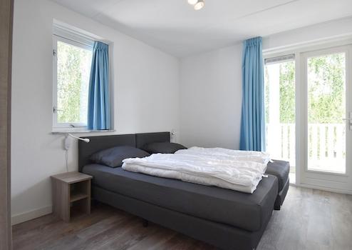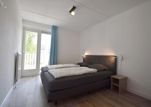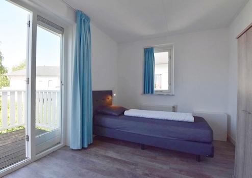 Das geräumige Hauptschlafzimmer bietet eine serene Schlafumgebung mit modernem Boxspring-Bett und stilvoller Einrichtung. Das große Fenster gibt schönen Ausblick über den Ferienpark, während der direkte Zugang zum Balkon für frische Luft und Außenbereich sorgt. Die neutralen Farbtöne und durchdachte Aufteilung schaffen eine entspannte Atmosphäre, in der Sie wunderbar zur Ruhe kommen nach einem Tag voller Aktivitäten.