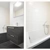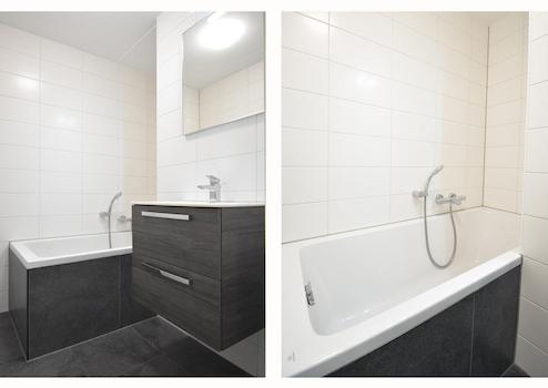 Die moderne Einrichtung kombiniert allen Komfort: eine geräumige Badewanne für entspannende Momente, eine begehbare Dusche mit Glaswänden zur Erfrischung, und ein stilvolles Waschbecken-Möbel mit Stauraum. Die hochwertigen weißen Fliesen und neutralen Farben verleihen dem Raum eine serene, spa-ähnliche Ausstrahlung.