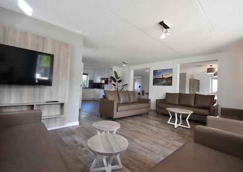 Die großen Fenster in beiden Räumen sorgen für viel natürliches Licht und Ausblick über den grünen Ferienpark. Eine einzigartige Kombination, die Sie nirgendwo anders finden.
