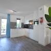 Diese einzigartige Unterkunft verfügt über zwei vollständig identische Küchen, die gespiegelt zueinander platziert sind. Beide Küchen haben dieselbe moderne L-förmige Aufstellung mit weißen Schränken, grauen Arbeitsplatten und kompletter Einbauausstattung: Kühlschrank, Geschirrspüler, Kombi-Mikrowelle, Induktionskochfeld und Edelstahl-Dunstabzug.