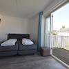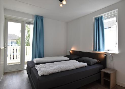 Das erste Hauptschlafzimmer in Piet Hein 214 bietet eine ruhige Schlafumgebung mit modernem Boxspring-Bett und direktem Zugang zum Balkon. Das große Fenster gibt schönen Ausblick über den Ferienpark und sorgt für viel natürliches Licht. Die neutralen Farbtöne und stilvolle Einrichtung schaffen eine entspannte Atmosphäre, in der Gäste wunderbar zur Ruhe kommen nach einem Tag voller Aktivitäten.