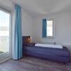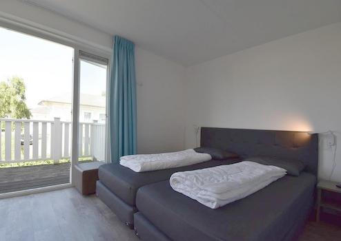Das vierte Schlafzimmer, gelegen in Piet Hein 216, bildet das zweite Hauptschlafzimmer dieser einzigartigen Unterkunft. Mit modernem Boxspring-Bett und direktem Zugang zum Balkon bietet dieser Raum Komfort und Außenbereich. Das große Fenster gibt Ausblick über den grünen Ferienpark und sorgt für eine helle, fröhliche Atmosphäre. Perfekt für Gäste, die Raum und Aussicht lieben.