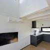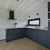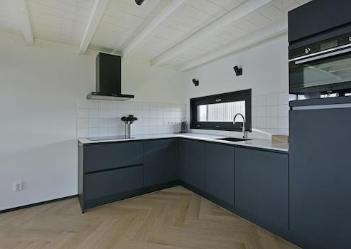 Die Küche präsentiert sich in stilvollem Anthrazitgrau mit heller Arbeitsplatte – ein harmonischer Kontrast und zeitgemäßes Design. Ohne Oberschränke wirkt der Raum offen und luftig. Die schwarze Kamin-Dunstabzugshaube setzt ein elegantes Highlight über dem Induktionskochfeld. Außerdem verfügt die Küche über einen Quooker, eine Kombi-Mikrowelle und einen Kühlschrank mit Gefrierfach. Das Fenster über der Spüle sorgt für angenehmes Tageslicht und einen schönen Ausblick beim Kochen.