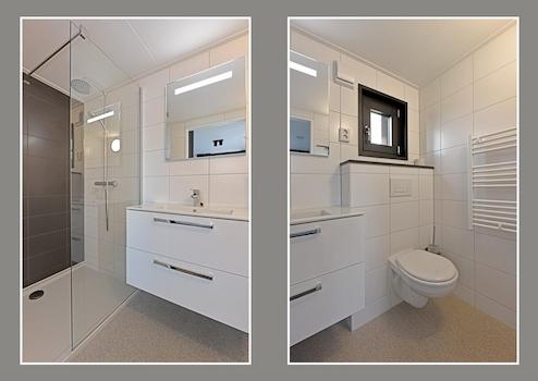 Dieses moderne Bad en Suite, direkt an das Hauptschlafzimmer angeschlossen, vereint Komfort und Stil. Die großzügige begehbare Dusche mit Glaswand verleiht dem Raum ein offenes, luxuriöses Gefühl. Das Waschbecken mit stilvollem Unterschrank bietet praktischen Stauraum, während das wandhängende WC für ein modernes Gesamtbild sorgt. Ein kleines Fenster bringt Tageslicht hinein – angenehm hell und gut belüftet.