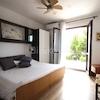 Die Wohnung hat eine Wohnfläche von 58 m² und verfügt über drei Schlafzimmer, eine Küche und zwei Badezimmer (eines davon im westlichen Schlafzimmer). Das westliche Schlafzimmer und die Küche öffnen sich zu einem 5 m² grossen Balkon, und die beiden südlichen Zimmer öffnen sich zu einer 18 m² grossen Terrasse mit freiem Meerblick.