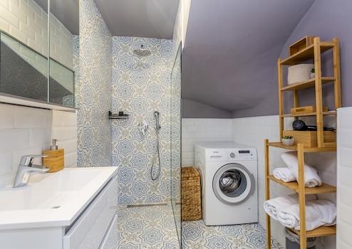 Die Doppelhaushälfte mit privatem Pool beinhaltet Parterre, Obergeschoss und einen ausgebauten Dachboden. Das Wasser des Pools (21,5 m2 Fläche) wird mittels einer Salzwasser-Elektrolyse kristallklar gehalten, ohne Chlor hinzufügen zu müssen. Der Pool hat eine Treppe für einen leichten Einstieg und eine Sitzbank mit Jets.