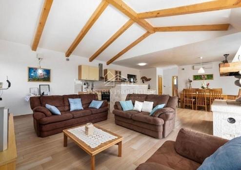 Im Erdgeschoss befinden sich ein Wohnzimmer mit Essbereich und Küche, ein Schlafzimmer mit eigenem Bad, ein zusätzliches WC und eine Waschküche. Im ersten Stock befinden sich zwei Schlafzimmer mit eigenen Bädern und eine Terrasse. Beide Terrassen bieten einen wunderschönen Panoramablick auf die istrische Landschaft und das Meer.