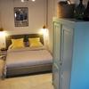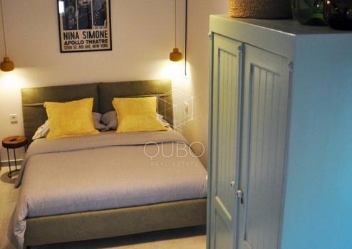 Erdgeschoss: Schlafzimmer und modernes Badezimmer mit Dusche.