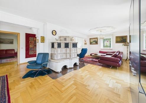 Das Haus überzeugt mit einem offenen, hochwertig ausgestatteten Wohnbereich, einer modernen Design-Küche mit Hark Kaminofen sowie einem stimmungsvollen Kachelofen, der zusätzliche Wärme und Behaglichkeit schafft. Die Böden sind mit edlen Fliesen und Parkett ausgelegt und verleihen jedem Raum ein stilvolles Ambiente.