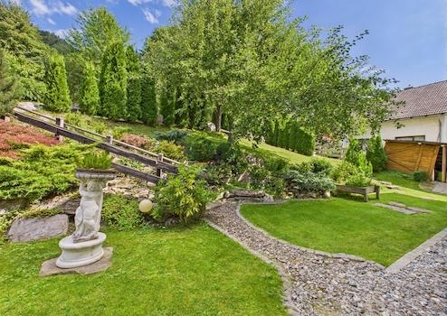 Der Zugang zur großzügigen Terrasse mit Blick in den rund 766 m² großen Garten erfolgt über den Kellerbereich, der zudem über einen separaten Eingang verfügt und sich hervorragend zur Nutzung als zweite Wohneinheit, Gästequartier oder Homeoffice-Bereich eignet. Die 2. Terrasse befindet sich hinter dem Haus und ist vom oberen Eingang oder der Küche erreichbar.