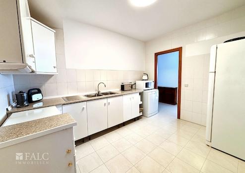 Die separate Küche ist vollständig ausgestattet und bietet neben einer praktischen Vorratskammer auch eine eigene Waschküche, was zusätzlichen Komfort im Alltag schafft. Der Schlafbereich der Wohnung umfasst zwei großzügige Doppelschlafzimmer und ein weiteres Einzelzimmer – alle ausgestattet mit praktischen Einbauschränken. Ein voll ausgestattetes Badezimmer sowie ein zusätzliches Gäste-WC runden das Raumangebot ab.