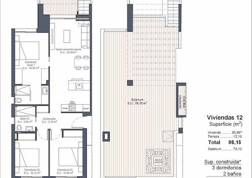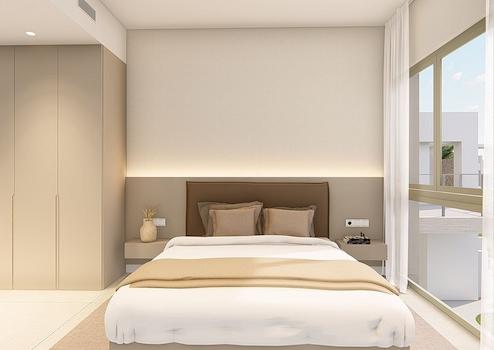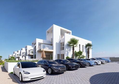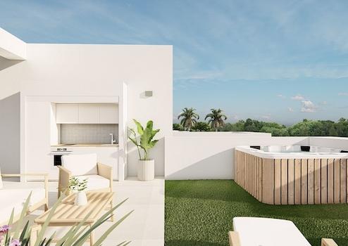 Obergeschoss-Wohnungen mit 3 Schlafzimmern, 2 Bädern, Dachterrasse, Klimaanlage, Einbauküchen mit Elektrogeräten, Kfz-Stellplatz und Gemeinschaftspool